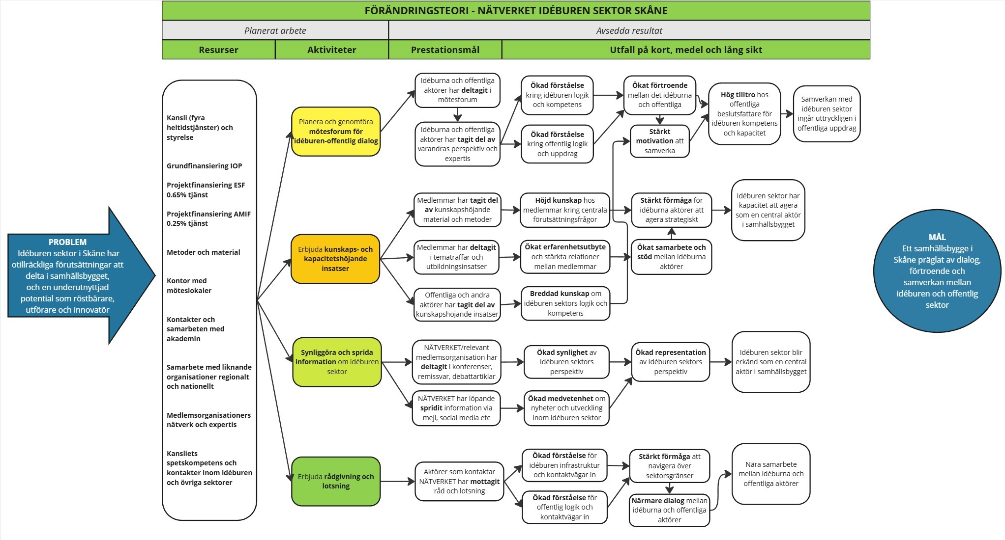NÄTVERKET arbetar mot en långsiktig målsättning där samhällsbygget i Skåne präglas av dialog, förtroende och samverkan mellan idéburen och offentlig sektor. Genom ett mer systematiskt uppföljnings- och utvärderingsarbete vill vi stärka sannolikheten för att nå detta mål. NÄTVERKET arbetar därför sedan 2024 utifrån en egen förändringsteori, som beskriver vilka insatser som ska leda till vilken förändring och varför vi tror det kommer ske.